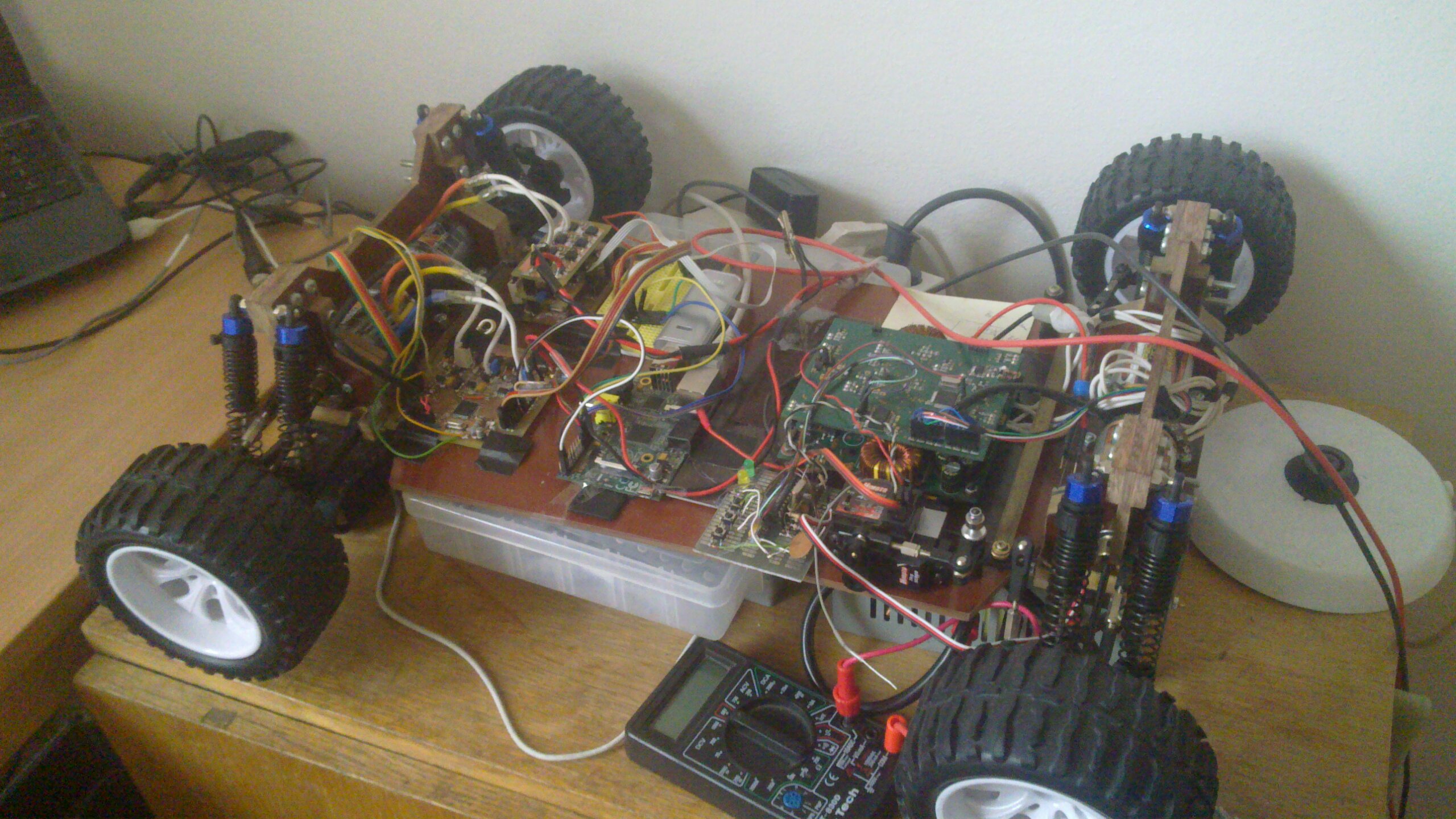 For the first post in new category – electronics, I have decided to share a first glimpse of the project I’m working on for my diploma thesis. It is a model of electric vehicle, more precisely radio-controlled model car, driven by four microprocessor-controlled three-phase brushless (BLDC) electromotors. Rear motors are controlled by custom BLDC drivers based on PIC18 MCUs, front motors by custom driver based on STM32 MCU (my colleague’s work). These three communicate via SPI with the main computer – our beloved Raspberry Pi (currently model B with a mess of wires SPI level converter shield).