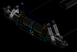 The vehicle’s chassis is based on standard 1:10 plastic model chassis, but heavily modified by enlarging external dimensions and using four motors directly connected to wheels. The new chassis was designed in AutoCAD and milled from plates of Textit (cotton/formaldehyde laminate).