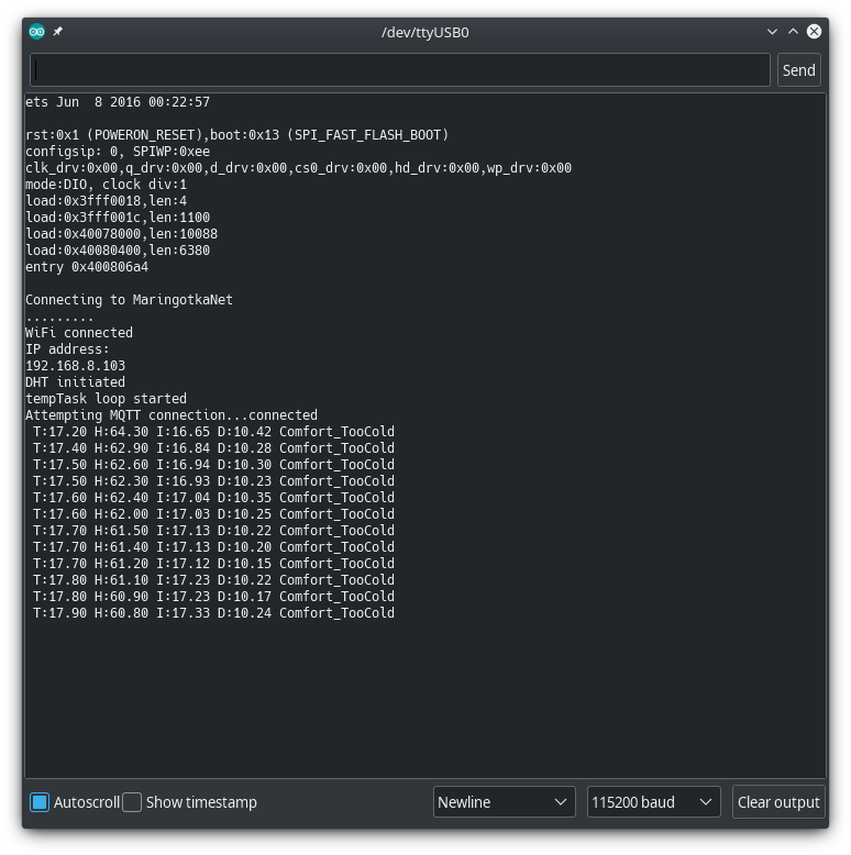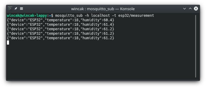Now if everything goes as expected the ESP32 should boot up, connect to the broker and start sending measured values periodically.