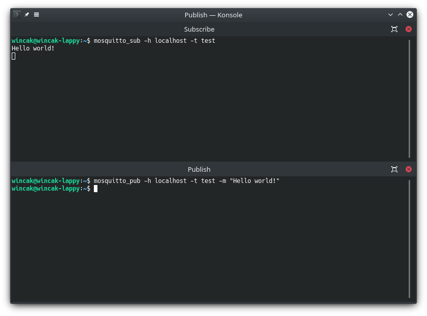 MQTT protocol is a publish-subscribe protocol that works over TCP/IP connections. One or more clients are connecting to a single broker and exchanging information with it. In the most simple case one client sends data to the broker – publishes in a given topic. Anyone who connects to this broker and subscribes to the topic gets notified when new data arrive.