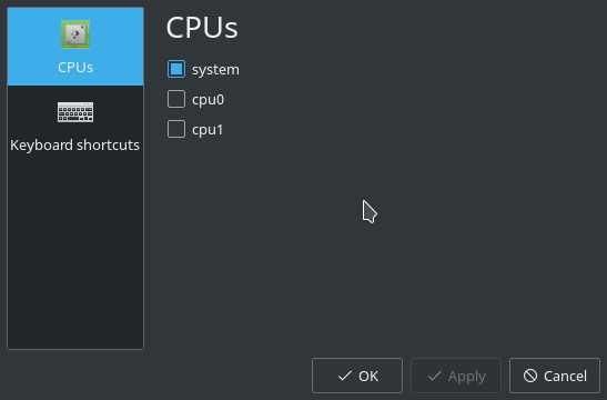 What the hell is this? The default CPU load on Xfce has way more options! All other system monitoring widgets are short on features in similar fashion and embed in thin panels in really awful way. Seems like these are only proof-of-concept for now. Similar shortages can be found while trying to configure for example KSysGuard or system notifications (please, please, let me at least show them in the UPPER right corner!).