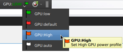 Just create missing menu items in the same the same way as the previous two, put the default one (more later in this post) on top and check “Show last used item in panel” option in Launcher Settings -> Advanced. This way the currently used power profile should be displayed in the panel all the time.